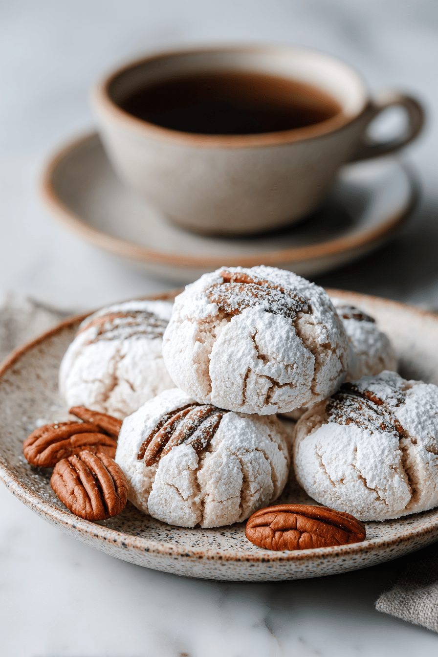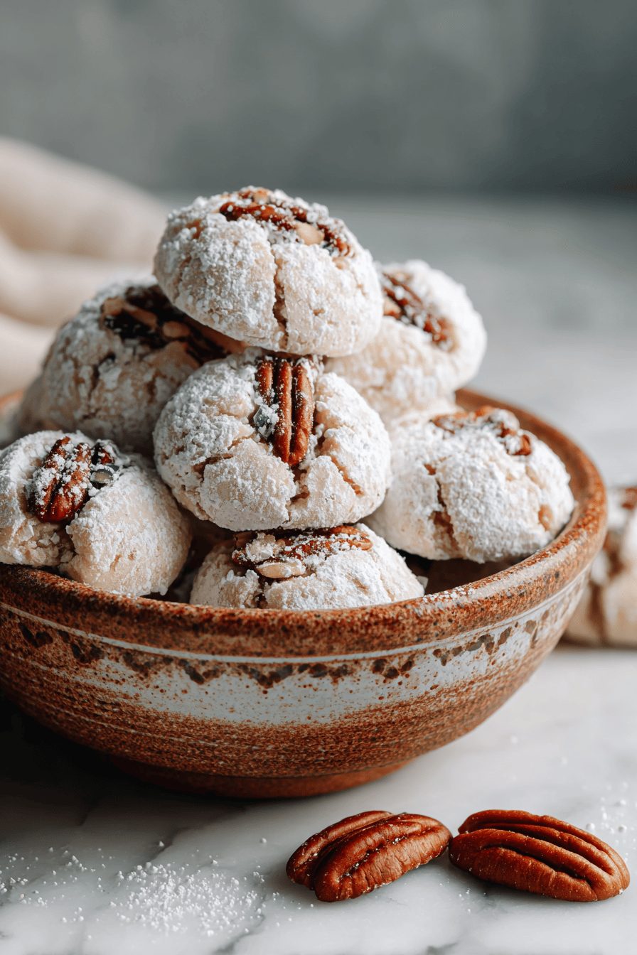 These cookies are the kind of recipe that laughs at precision. I’ve made them after two glasses of wine and an interrupted phone call, and they still turned out. Fun fact: toasting pecans first gives a glow-up so big it should have its own Instagram account. Once I tried swapping in browned butter because I was feeling fancy — total win. Also, don’t be surprised if the powdered sugar melts a bit on top if the cookies are too hot; that’s fine — re-dust after they cool and pretend it was intentional artistry.