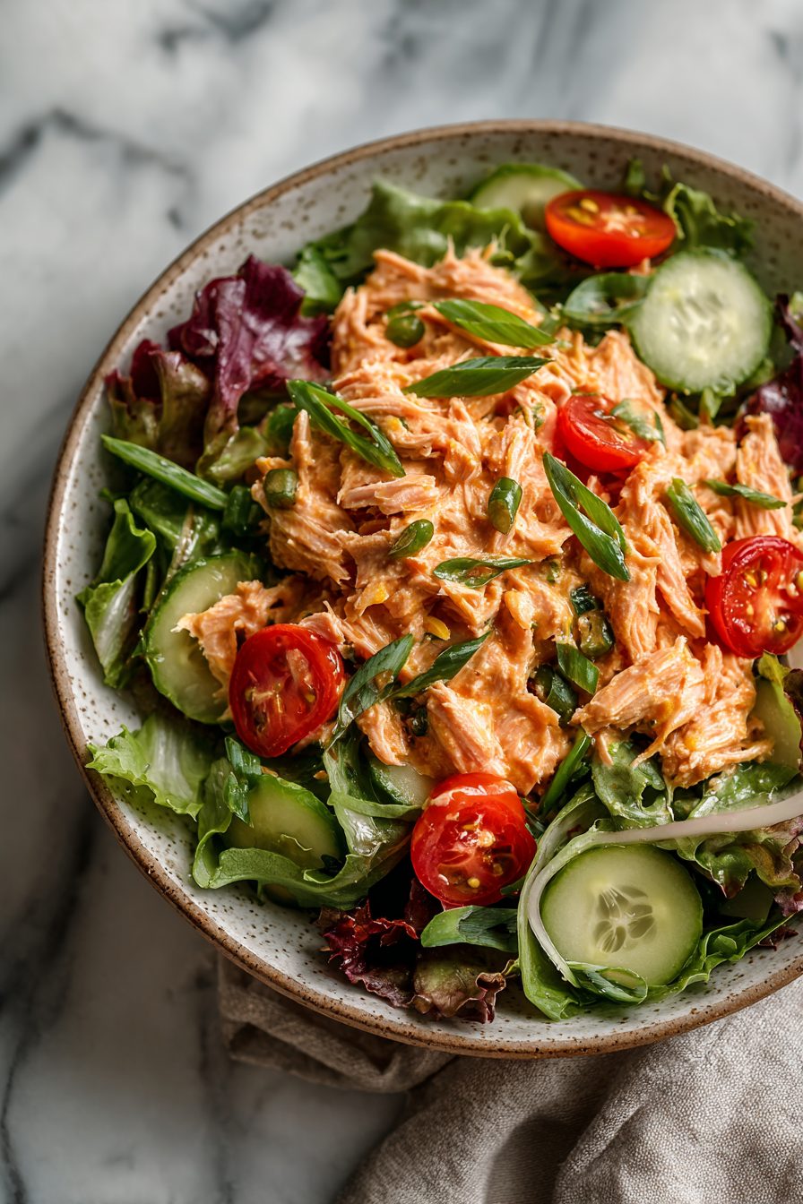 My husband worships this salad like it’s a holy relic. He will literally show up at 9 p.m. and beg for the “spicy tuna thing” even if we had tacos earlier. Our kiddo calls it “the spicy fish dip” and eats it with cucumbers like it’s dessert. I made it the first time after a grocery fail — I meant to buy chicken but came home with a tower of canned tuna by accident — and it stuck. Now it’s the emergency MVP for late work nights, hangovers, and last‑minute guests.