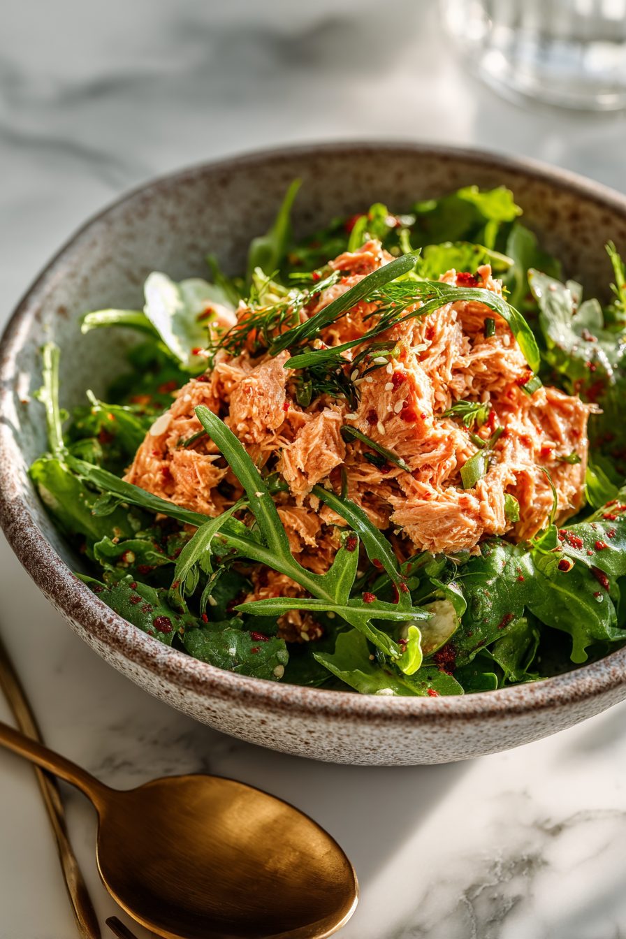 This tuna salad is the fast, noisy kitchen hack I fall back on when the week collapses and everyone wants dinner now. It’s basically canned tuna doing the heavy lifting with a spicy kick, a creamy binder, and something bright to cut through the richness — four ingredients, zero fuss, maximum “I made dinner” credit. It’s great for sandwiches, scooped on crackers, or thrown on top of a pile of greens for the kind of satisfying lunch that tastes like more effort than it was.