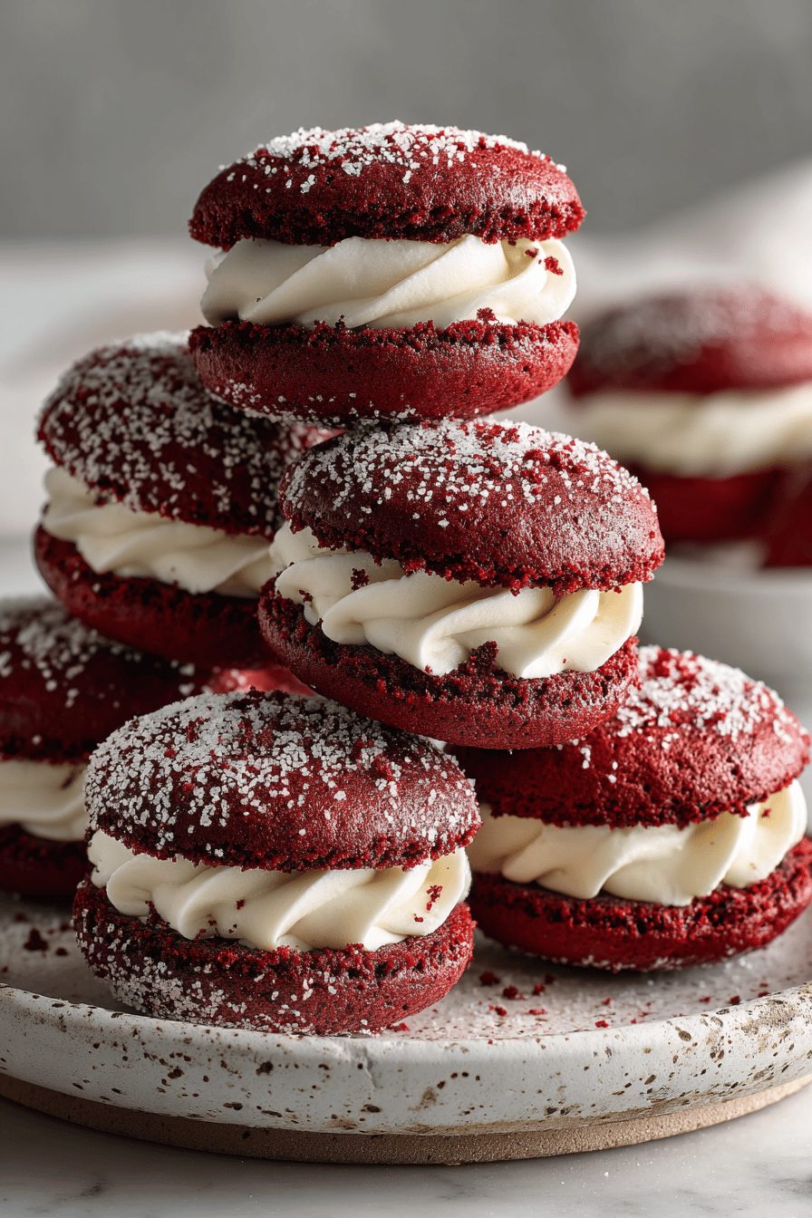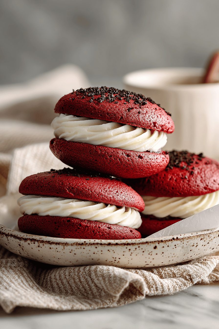 I’ll be honest — these red velvet whoopie pies are the kind of dessert that makes me feel like a slightly dangerous baker: gooey, cakey, and not trying too hard. Soft red cake rounds sandwich a tangy, billowy cream filling, and they ride that sweet/tangy line perfectly. They’re showy enough for a party but stupid-easy for a Tuesday night when you want something cozy and ridiculous.