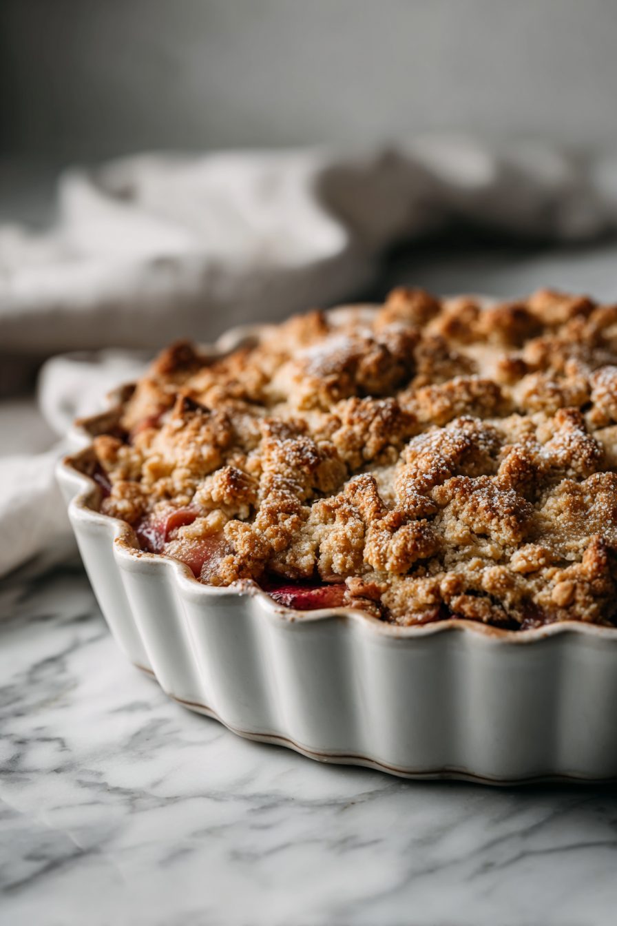 I always underestimate how much juice rhubarb will throw off. Expect a lot of pink steam and a sticky rim — it’s part of the charm. Once I tried tossing frozen rhubarb straight from the bag into the pan and the topping sogged a bit; lesson learned: thaw and drain a touch or bake a smidge longer.