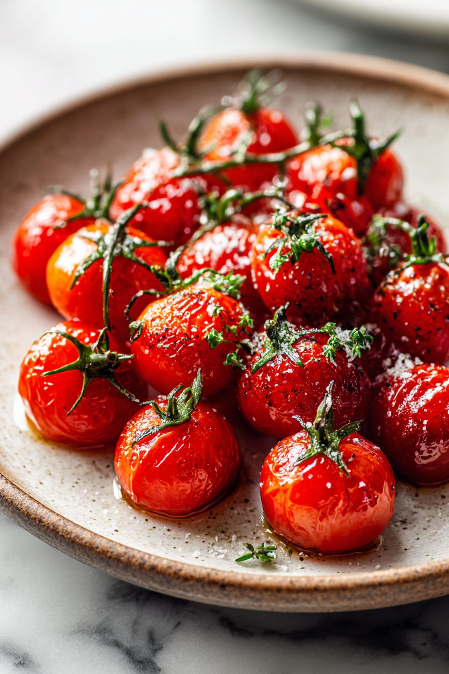 My husband pretends he doesn’t have preferences until these show up, and then he becomes a cherry tomato sommelier. The last time I made them, he hovered with a spoon “just to taste” and by the time I plated, half the pan was gone. Our kiddo calls them “tomato poppers,” which sounds chaotic, but it’s honestly the right vibe—bursting, sweet, messy. It’s become a Sunday habit to roast a tray, stash them in a jar, and spend the week playing mix-and-match: breakfast eggs, midweek pesto pasta, Friday grilled cheese with tomato confetti. Also, true story: I once dropped the entire pan (oven mitt fail), scooped what I could back into the dish, and it was still the best thing we ate that week. Floor-safe zone was in effect. We survived.