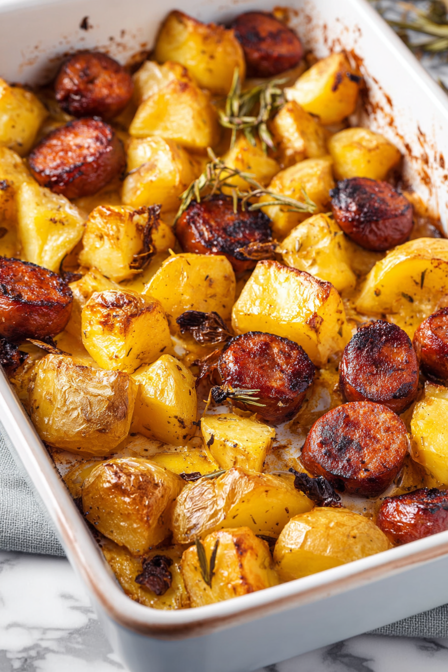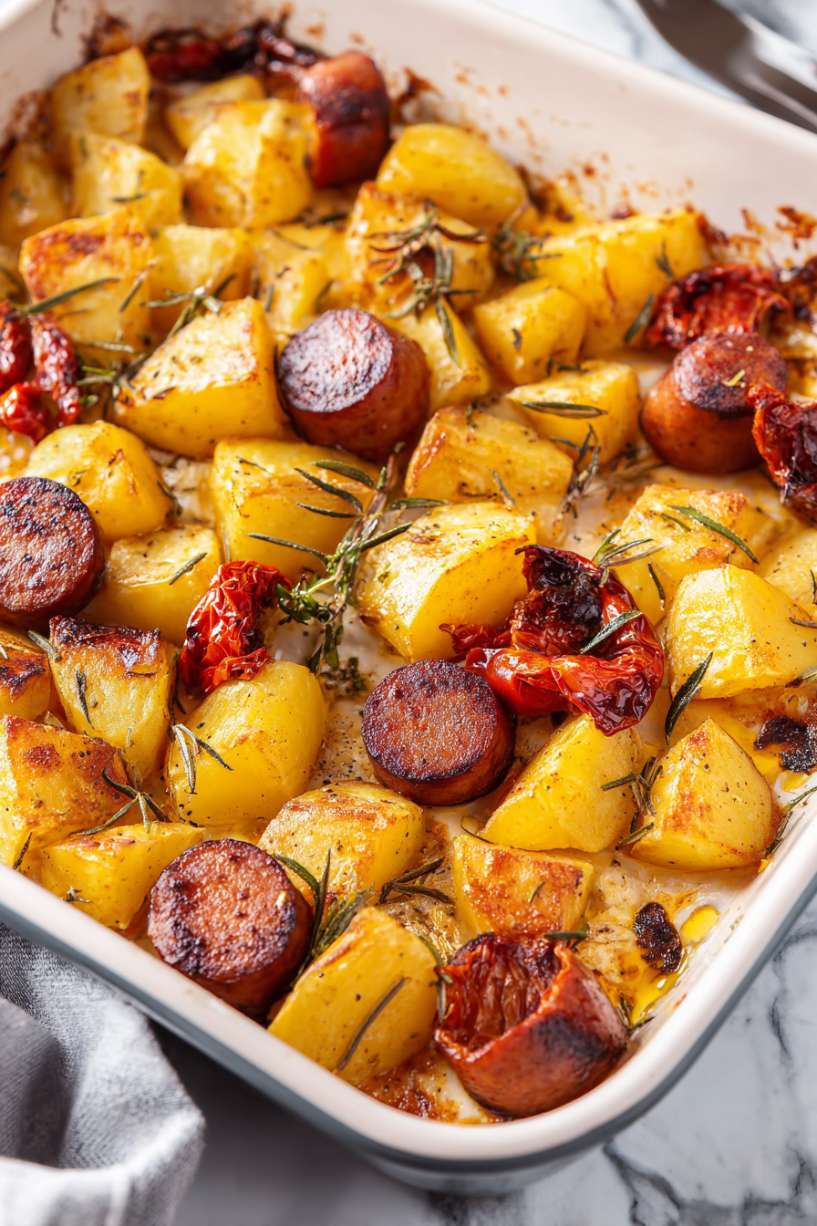 – If you’re short on oven time, par-roast the potatoes on a sheet an hour ahead and finish the bake with the sausages for crunch and speed.