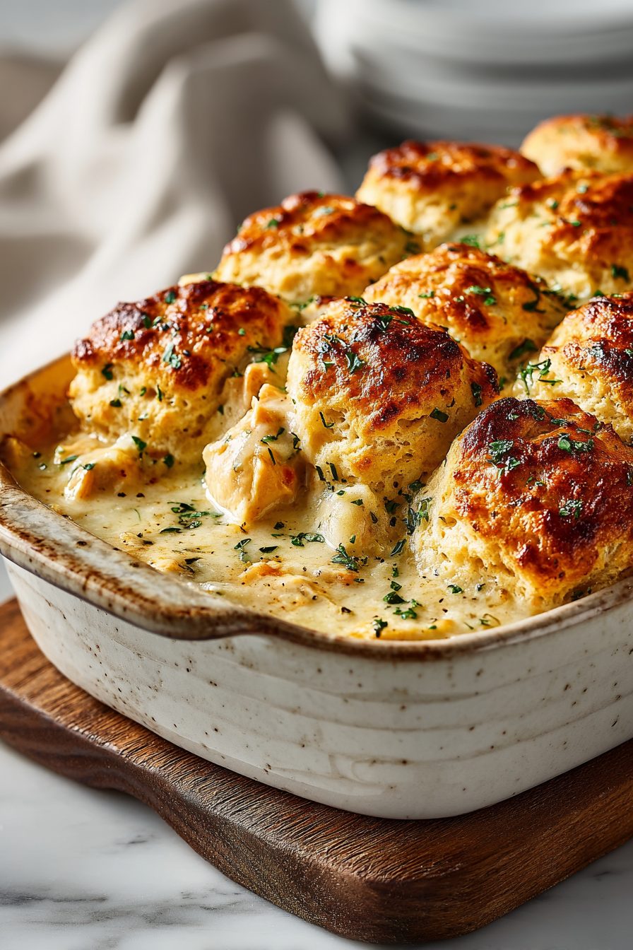 This casserole is comfort food in a pan: tender savory chicken stewed in a buttery, creamy sauce, topped with pillowy biscuits that get golden and slightly crisp around the edges. It’s the kind of dinner that feels like a hug after a long day — familiar, forgiving, and somehow fancy enough for company if you want to pretend you planned it all along.