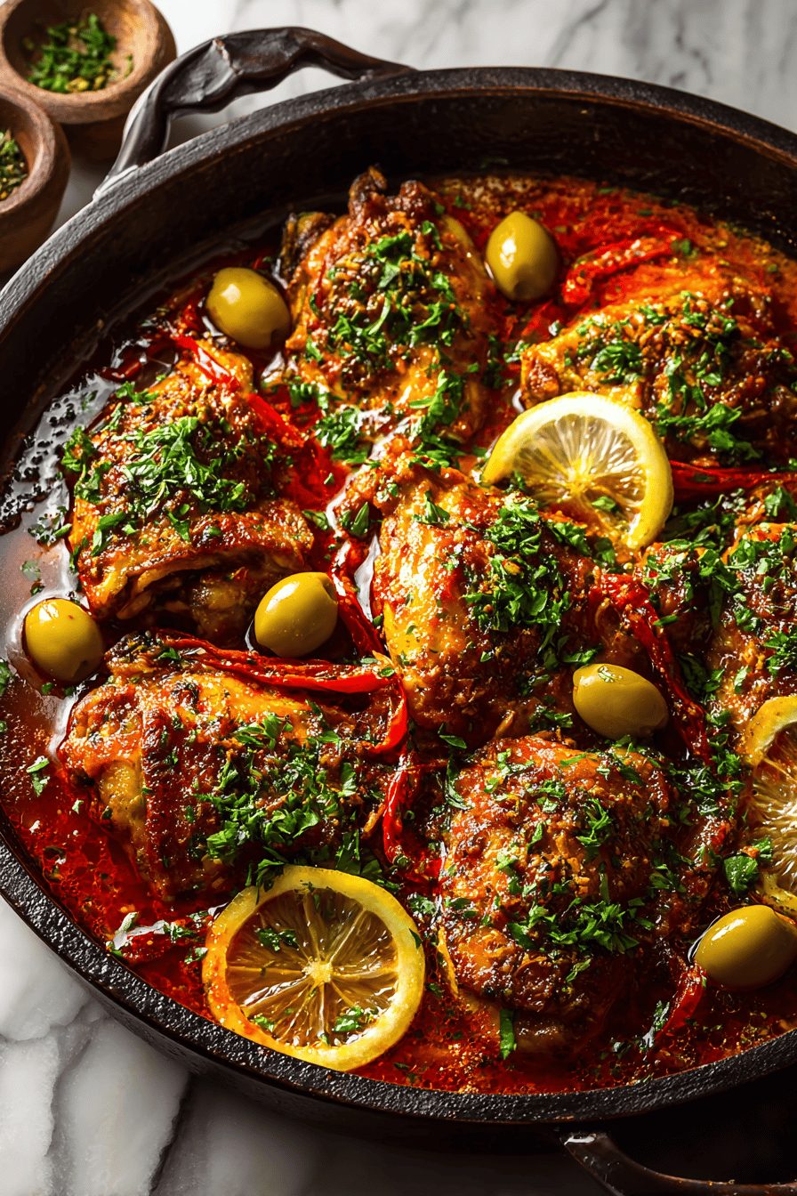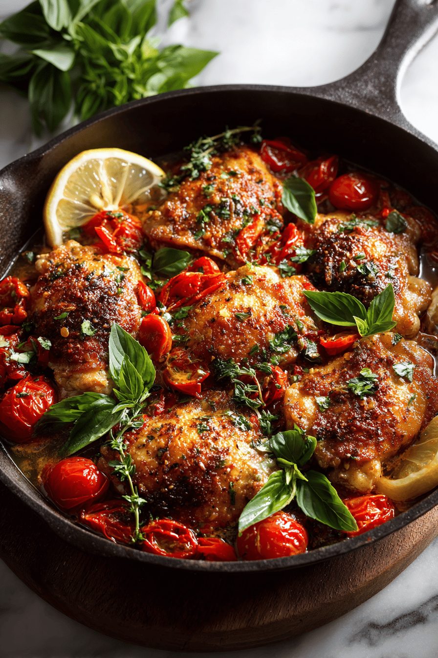 This skillet chicken is the kind of dinner that makes me feel like I actually know what I’m doing in the kitchen — pan-seared chicken with a rustic Sicilian-style tomato, olive, and caper sauce that’s briny, bright, and somehow cozy. It’s fast enough for a weeknight but fancy enough that guests think you planned it for days. The flavors are punchy: tangy tomatoes, salty olives, lemon, and a little heat if you want it. Try it because it’s forgiving, wildly flavorful, and leftovers are ridiculously good.