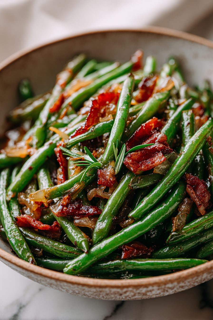There’s a tiny bit of theater in this dish: the onions take center stage. I’ve learned to be patient and let them caramelize low and slow — don’t rush them with high heat unless you like bitter bits. Once I accidentally used balsamic instead of red wine vinegar and, God help me, it was delicious; the whole family fought over the pan. Another time I tried sneaking in frozen beans straight from the bag — fine in a pinch but they won’t get the same snappy texture or fresh green bite. Also, if you brown the bacon first, use that fat for the onions. Trust me.