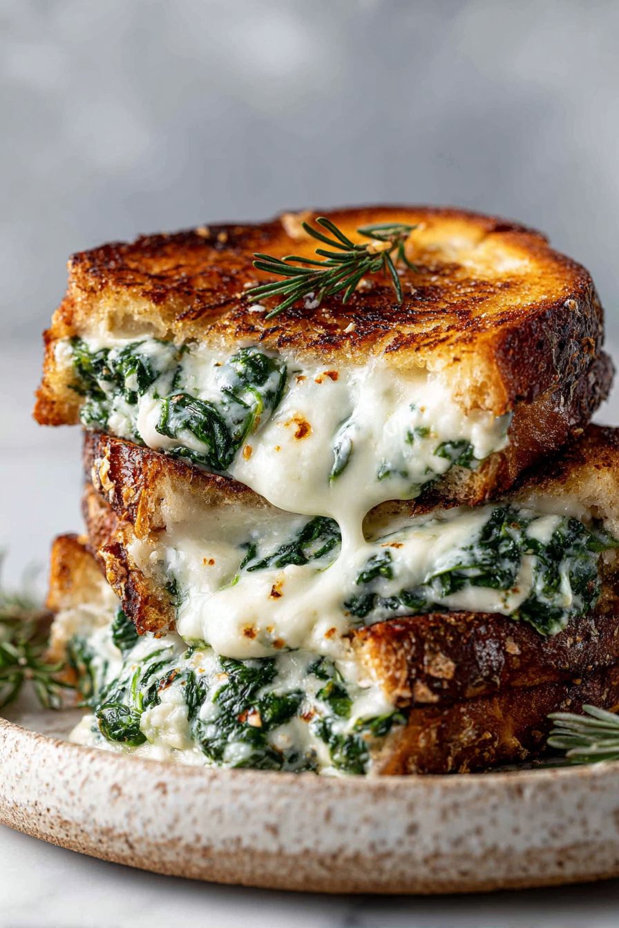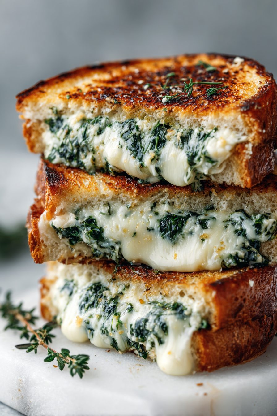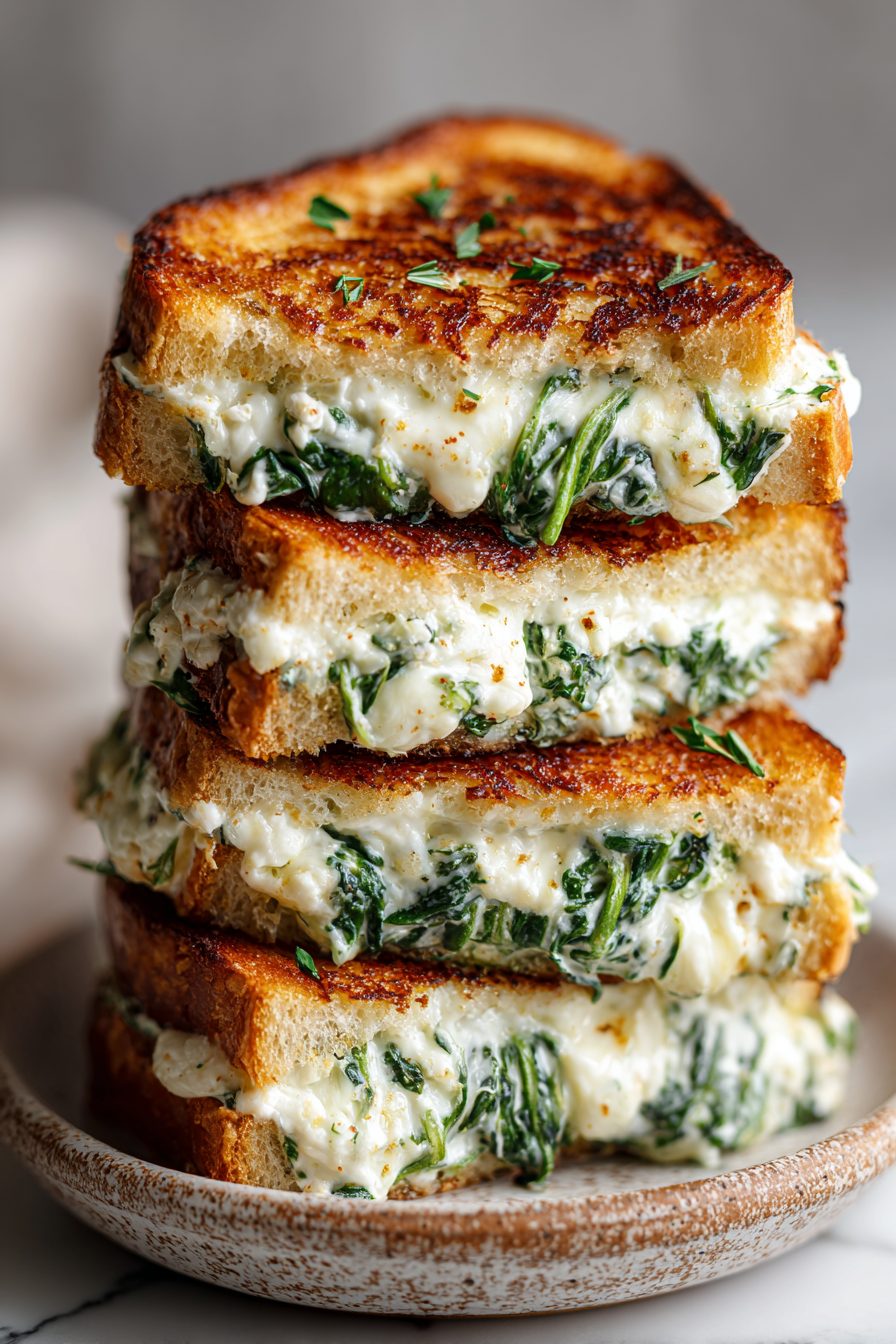 This sandwich is the sloppy, glorious cousin of the baked spinach artichoke dip — melty cheese, garlicky spinach, tangy artichokes, all smooshed between two perfectly browned slices of bread. It’s not fancy, but it’s the kind of dinner that feels like a hug and can be thrown together in the time it takes to argue about who washes the dishes.