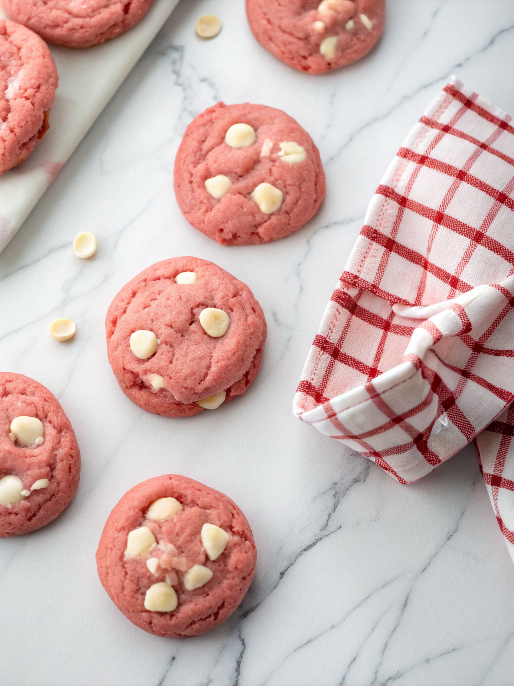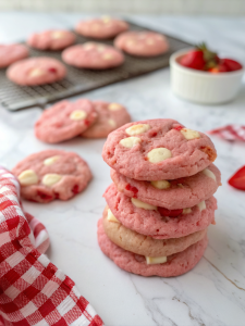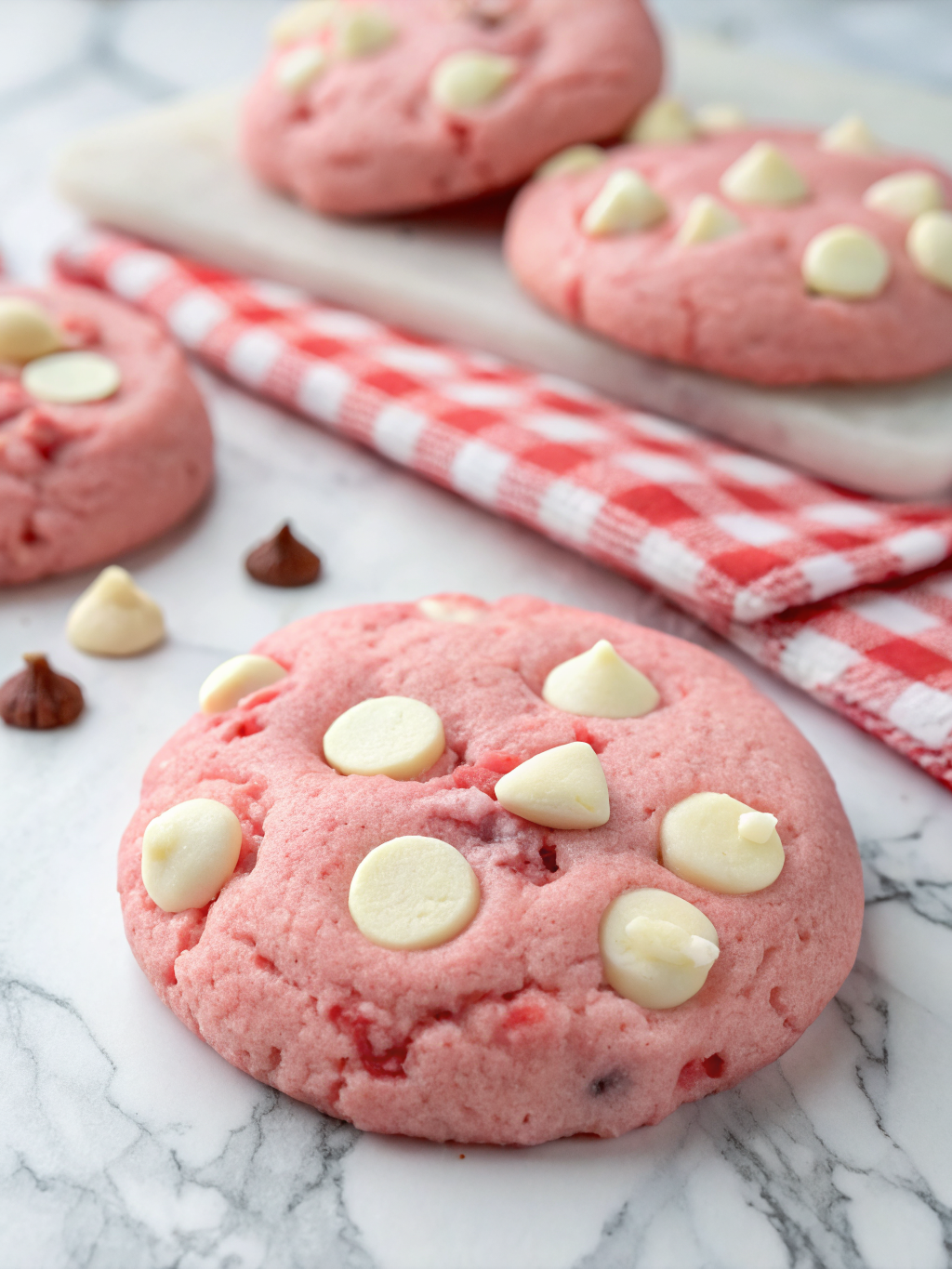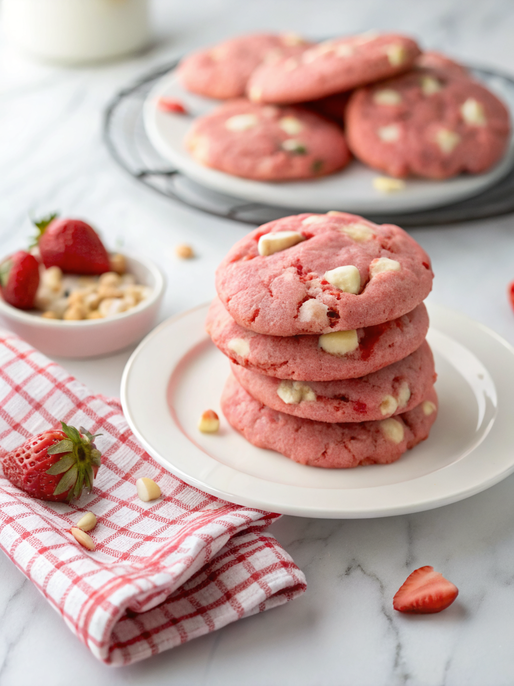 My husband declared these “officially dangerous” after one batch, which is basically a compliment from him. The kids call them pink cookies and fight over the crumbs. Once, I tried to make them without fresh strawberries (late winter panic) and ended up with too-sweet dried bits — lesson learned, but the family still ate the whole pan. They’ve become our weekend baking ritual; quiet Saturday morning, chaotic kitchen, sticky counters, forever trying to stop sneaking warm cookies off the tray.