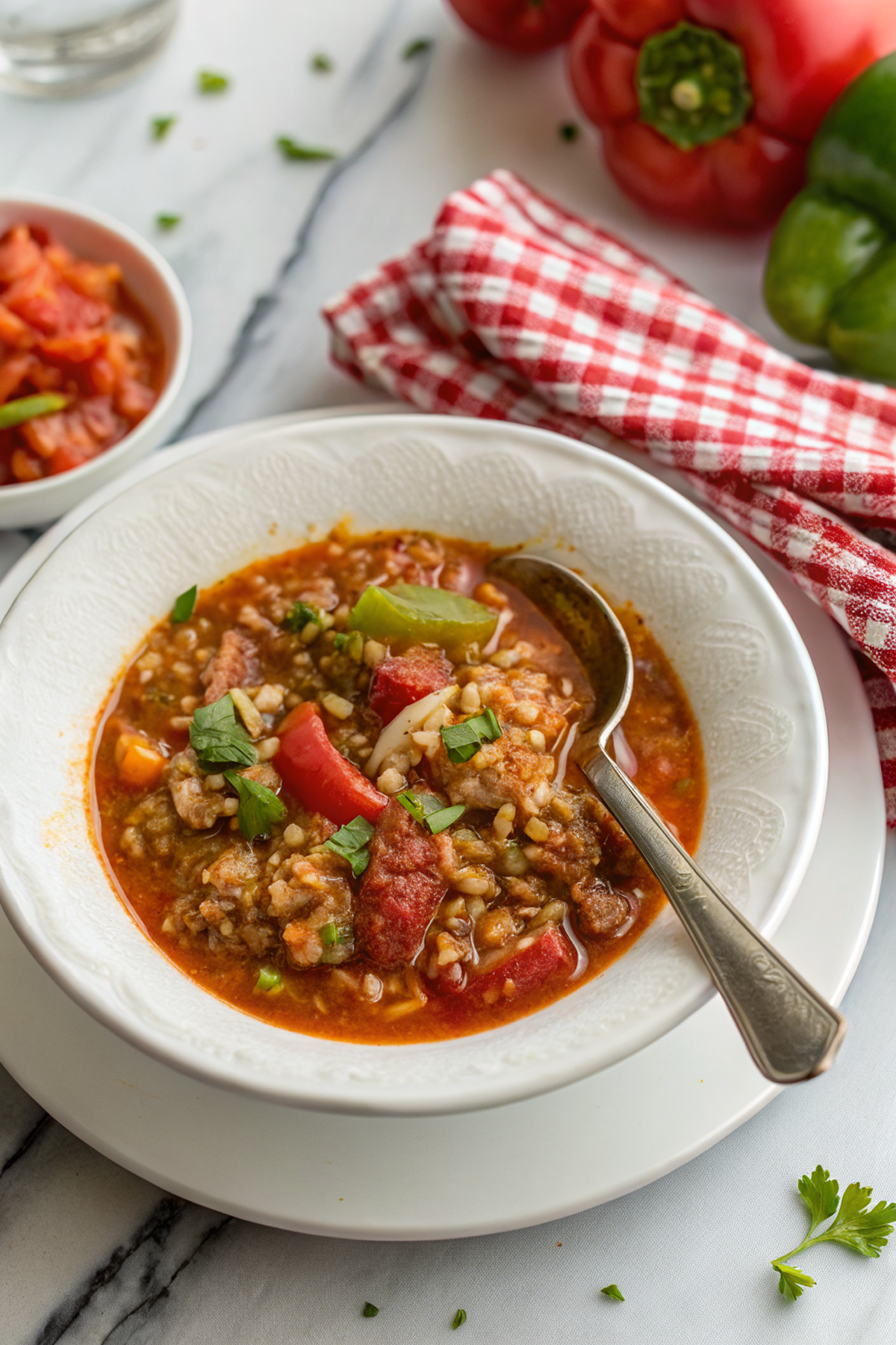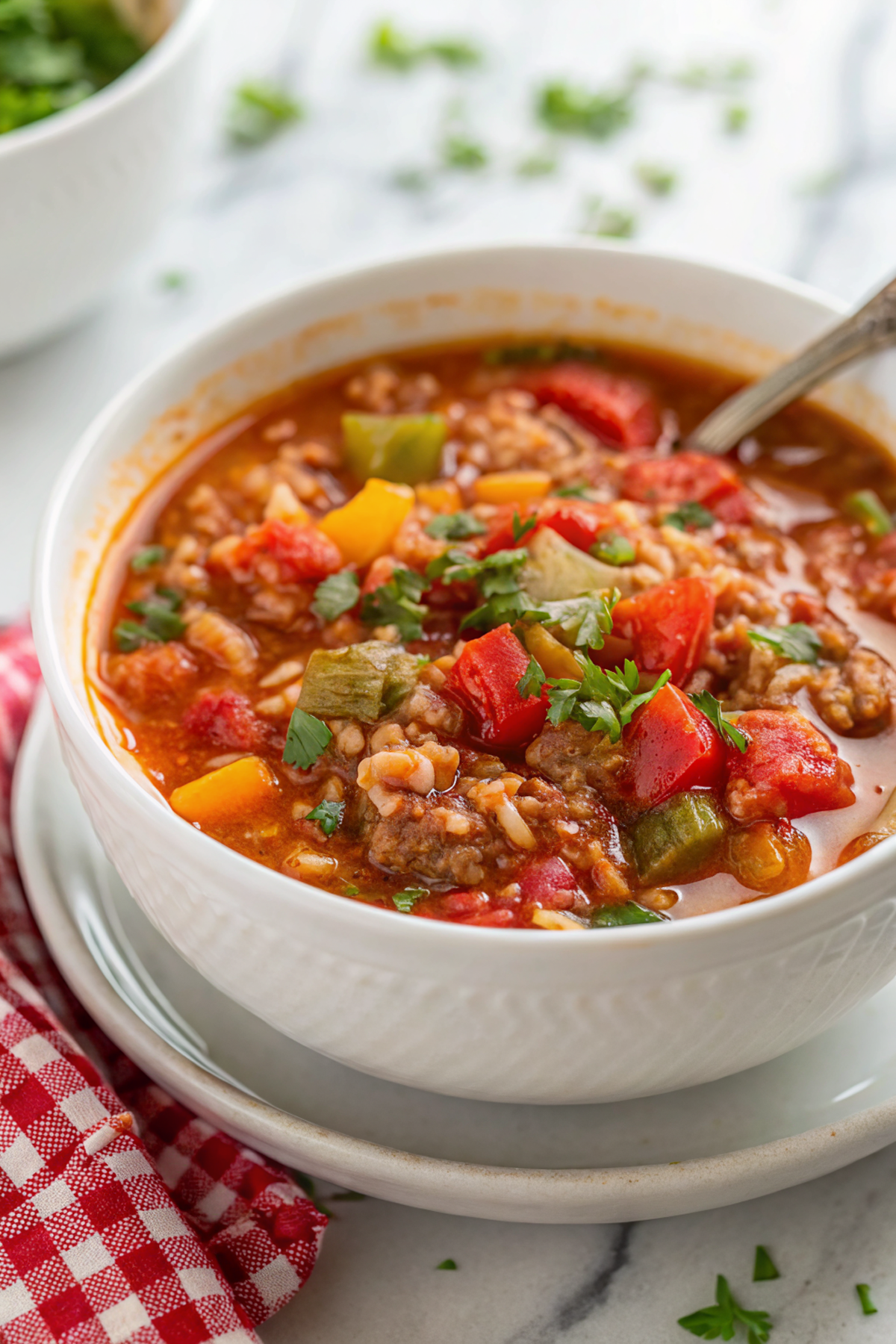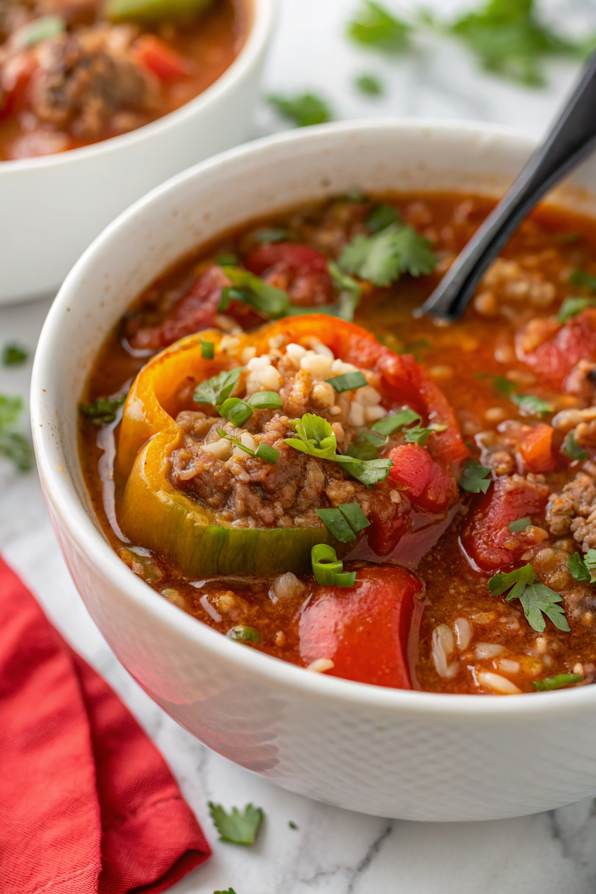 This soup is basically stuffed peppers in a bowl — all the cozy, peppery, beef-and-rice vibes but lighter and faster because we swap in ground turkey and skip hollowing out 12 bell peppers like it’s 1998 and we have nothing better to do. It’s chunky, tomato-forward, a little sweet from the peppers, and oddly comforting when life is chaotic and you need dinner that behaves.