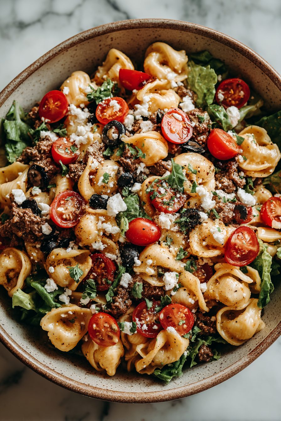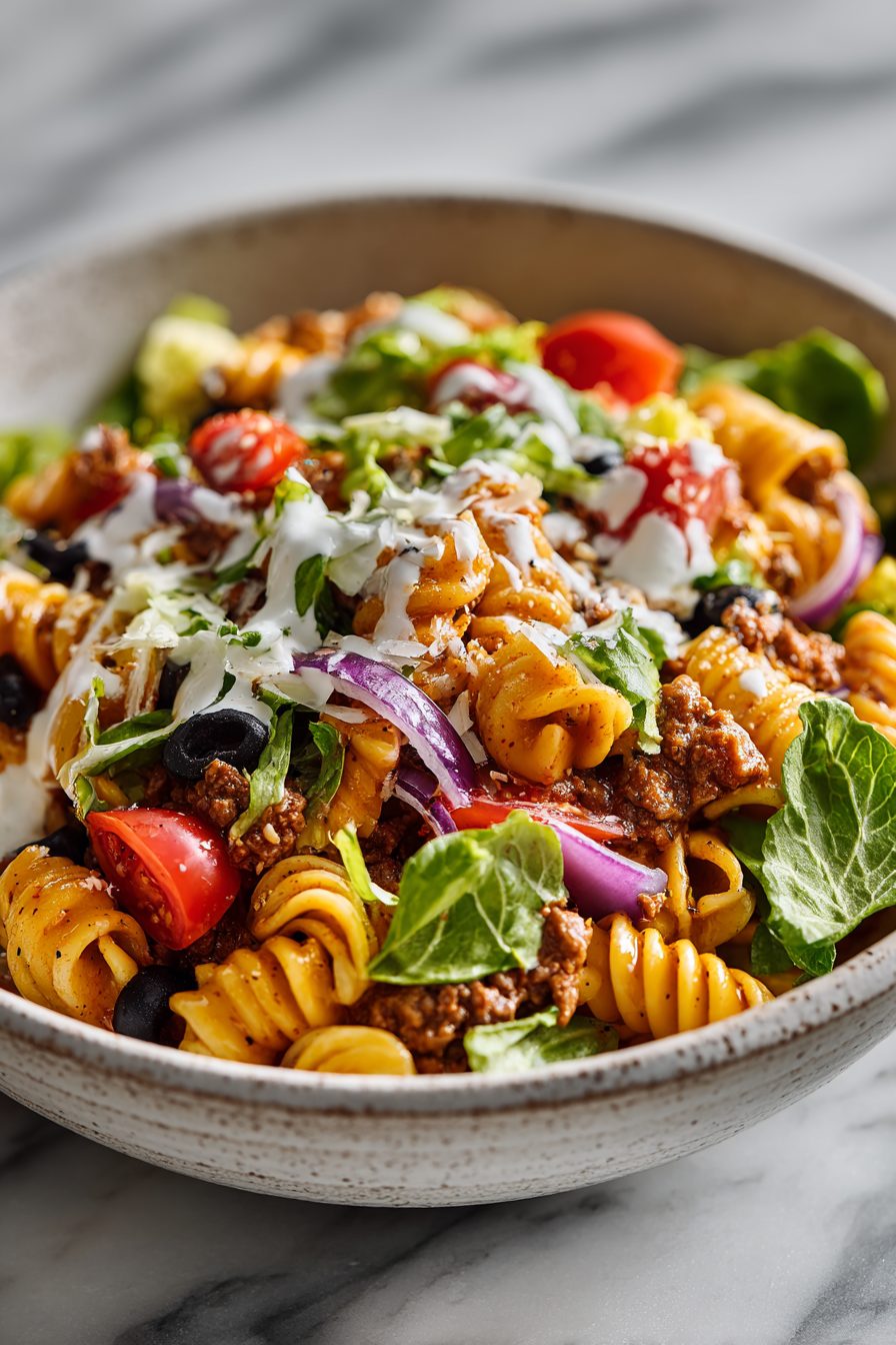 This one is pure kitchen chaos-meets-bliss. I once tried using leftover spaghetti (yes, long strands) and nearly created a pasta-forking circus, so I now stick to short shapes — shells, rotini, or penne. I’ve swapped ground beef for lentils and for a smoky vegan crumble; both work when you season the heck out of them. Also: don’t underestimate the power of letting the dressing hang out with the pasta for at least 30 minutes. It softens the edges and makes everything taste like it belonged together all along.
