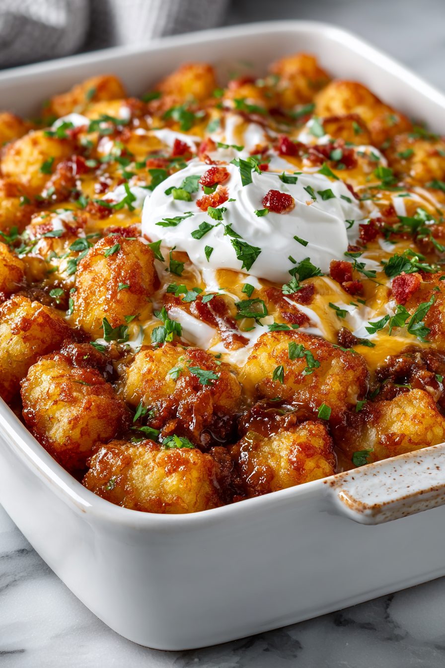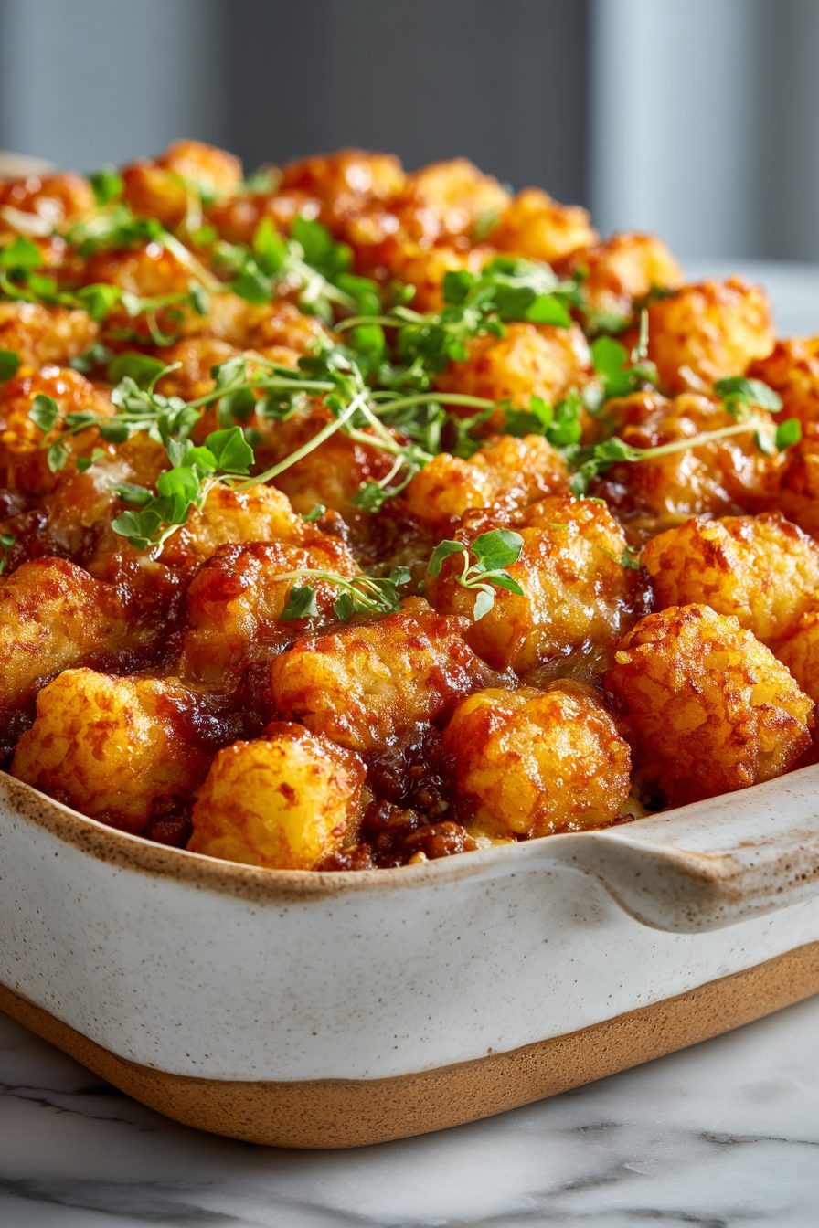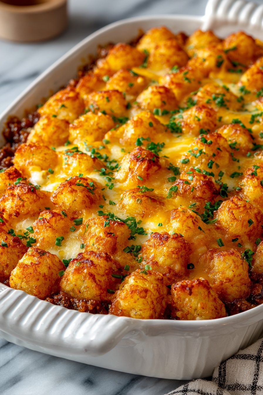 – Don’t rush the bake entirely — the tots need time to crisp and the filling to bubble; you can broil for 1–2 minutes at the end for extra top crunch.