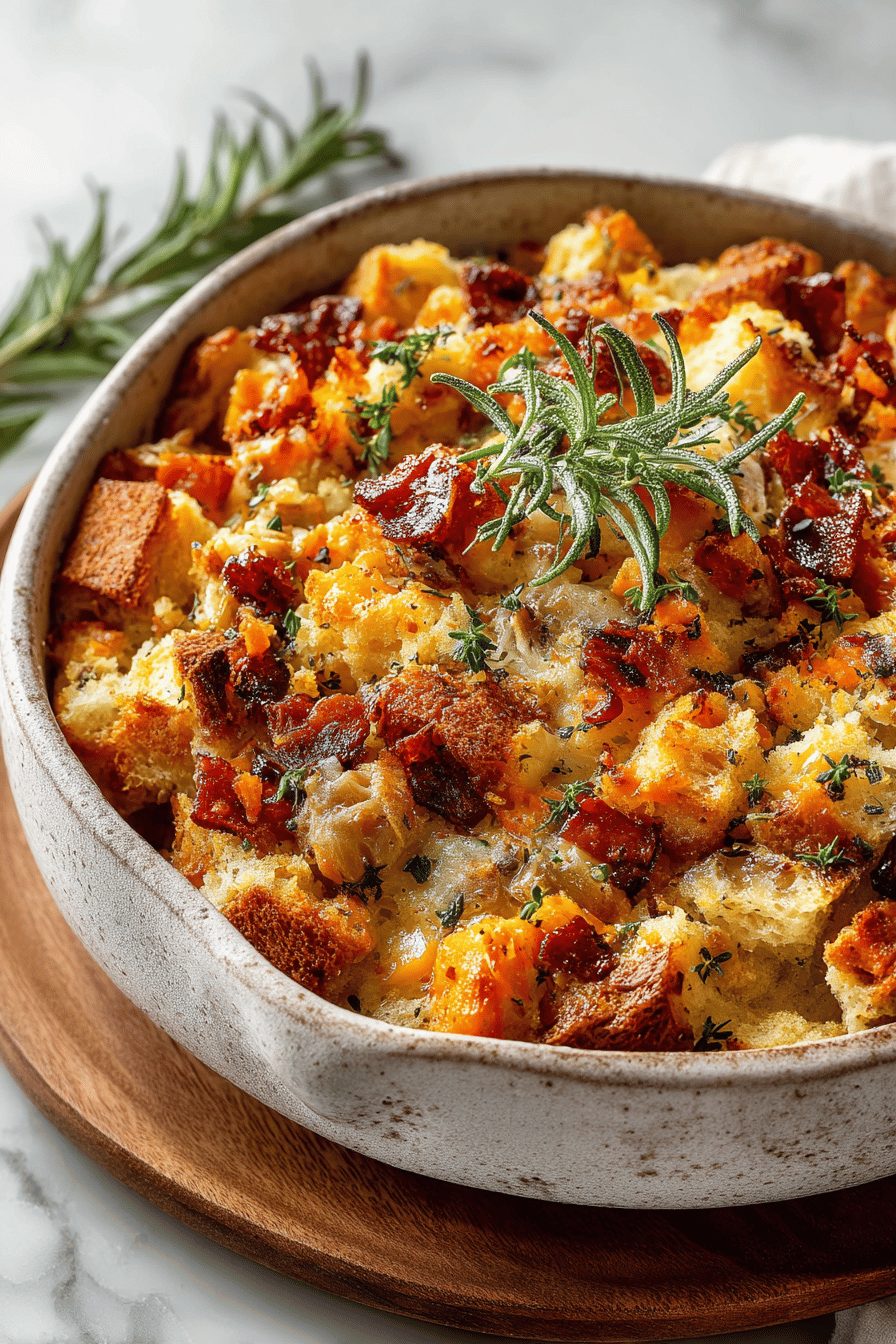 This is where my kitchen gets loud and messy in the best way. I once tried to stir raw sweet potatoes into the mix because I thought they’d cook through — they did not; they were crunchy and embarrassing. Now I roast any root veg first. I also learned the hard way that pouring cold gravy over cold turkey into a hot oven gives you a soggy center. Warm things up a little, marry the flavors on the stovetop, then bake. Also: breadcrumbs + parmesan on top = instant crowd-pleaser, every time.