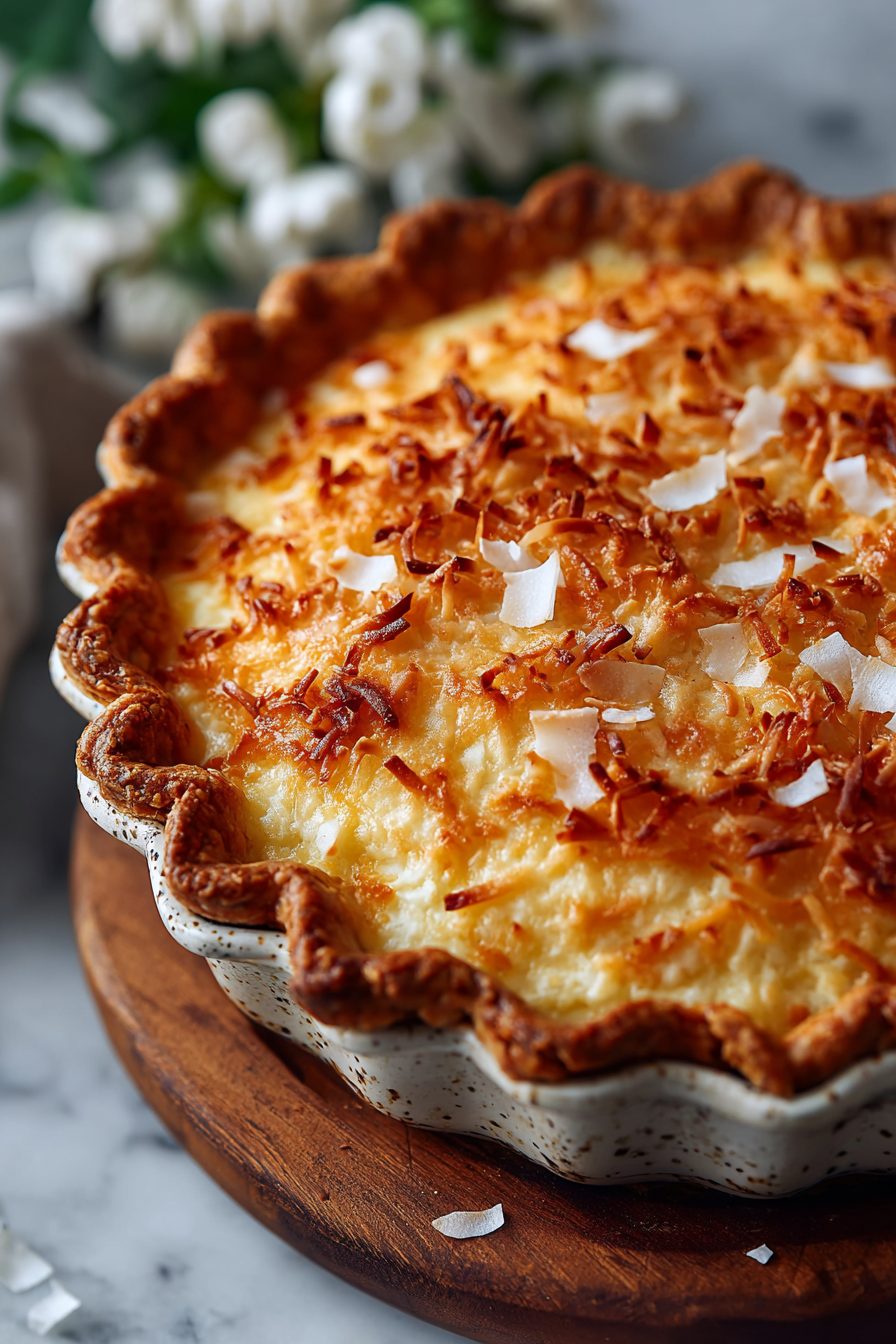 Store leftovers covered in the fridge for up to 4 days; the coconut topping will soften a bit, but it’s still delicious. Warm a slice in the oven for 5–7 minutes if you want crisp edges again, or enjoy cold for a custardy breakfast moment — I’ve totally eaten pie for coffee and I will do it again.