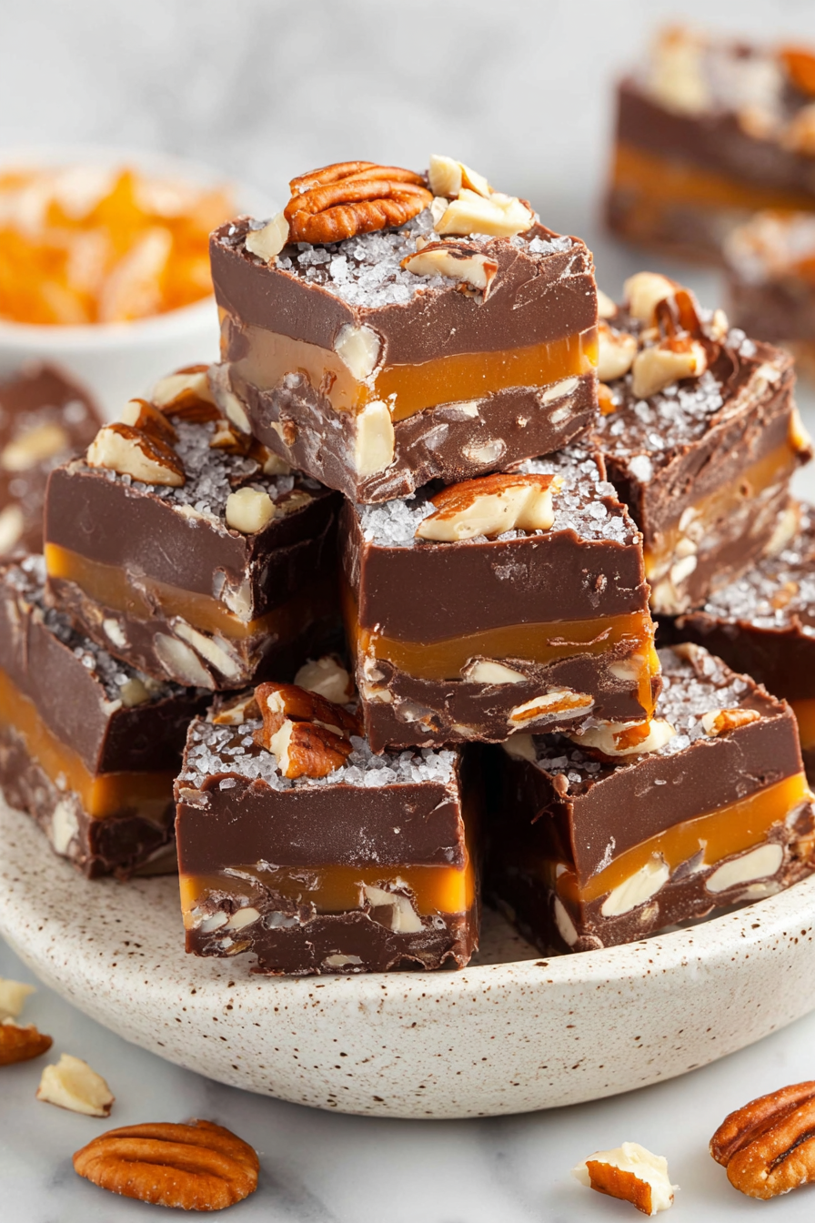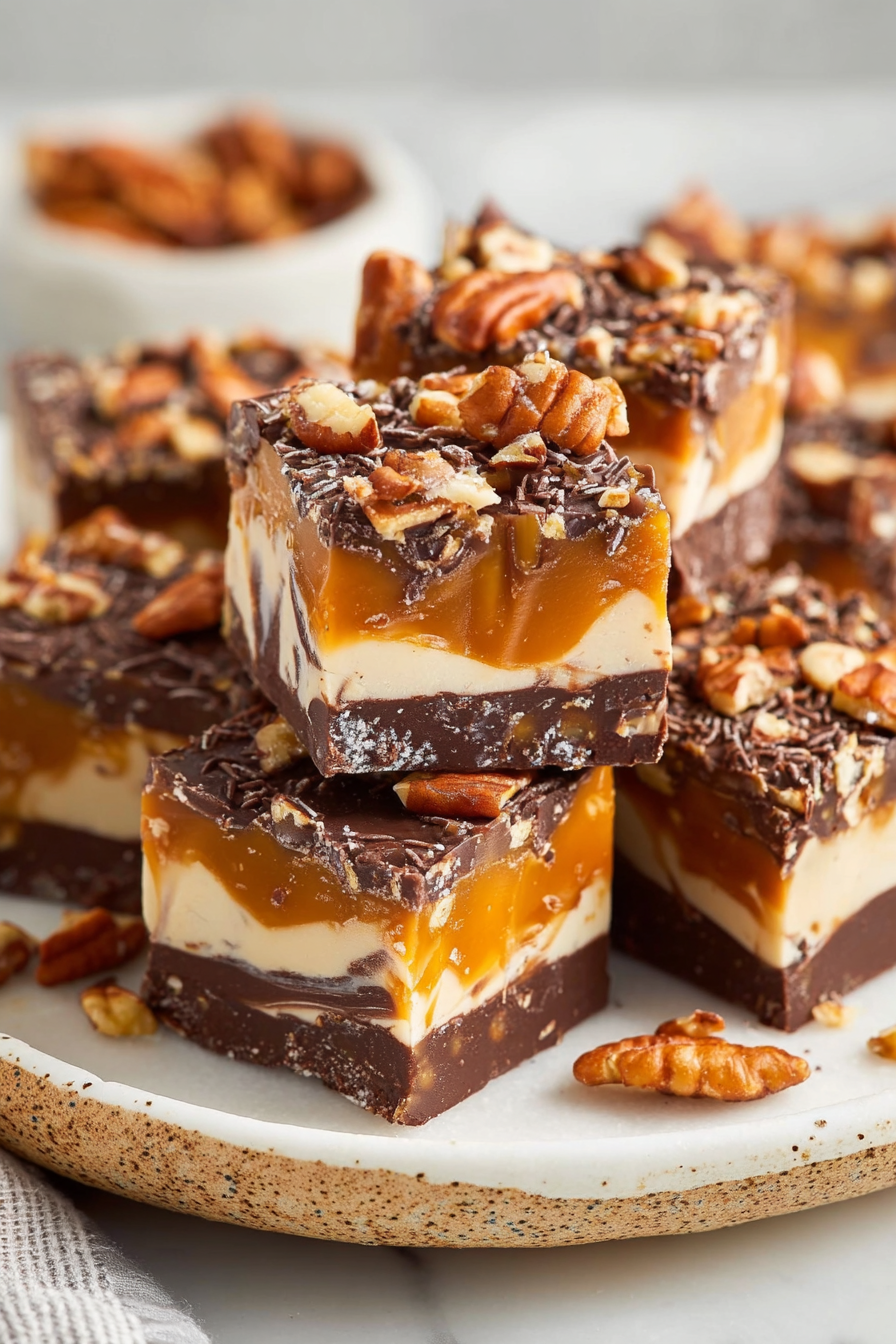 This recipe will make your kitchen smell like pure nostalgia — like grandma’s cookie box had a baby with a chocolate factory. I accidentally used slightly salty butter once and it was the best mistake ever (more complex, less sweet). Also, toast the pecans in a dry pan for a few minutes — it’s worth stirring constantly; I learn the hard way every time and burn a batch if I wander away. One time I poured the caramel too hot into the fudge and it sank to the bottom in a weird lava flow; still tasted great, looked less pretty. Embrace the imperfect swirls.