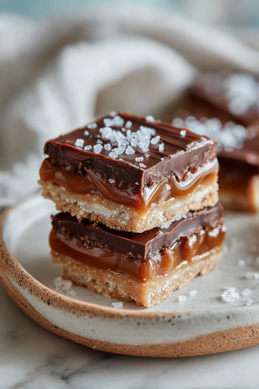 - Spread chocolate over caramel. Sprinkle flaky salt if using. Chill until firm, about 20 minutes.