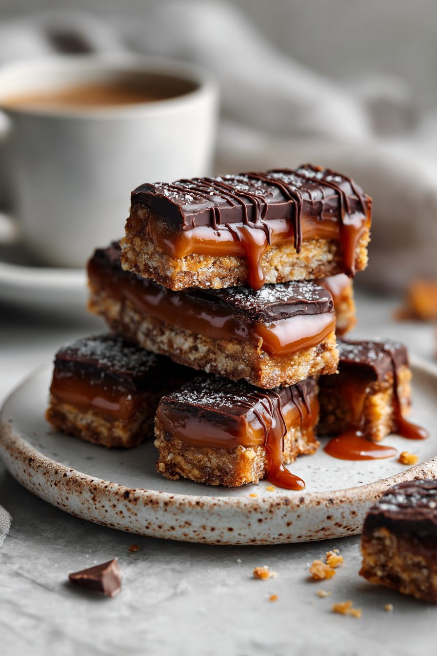 Keep these in an airtight container at room temp for a couple of days, or refrigerate for longer life — cold ones are firmer and snackable for breakfast if you’re morally dubious like me. They freeze well in layers separated by parchment; thaw in the fridge for best texture. If you eat them cold, the caramel will be chewier and the chocolate more brittle — perfectly acceptable behavior.