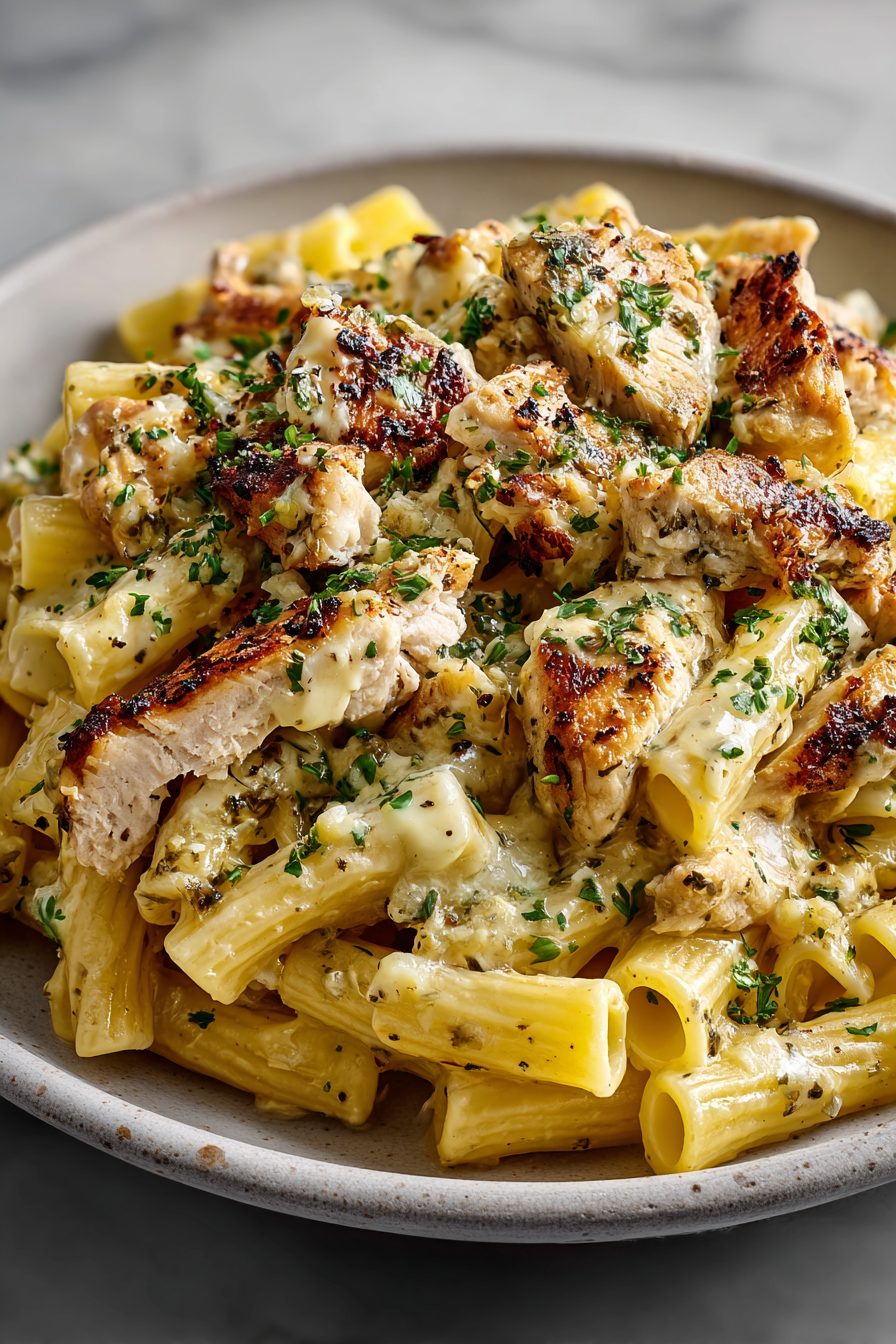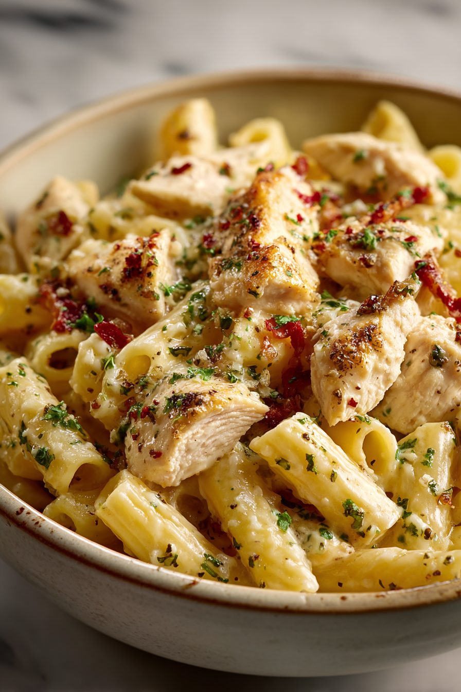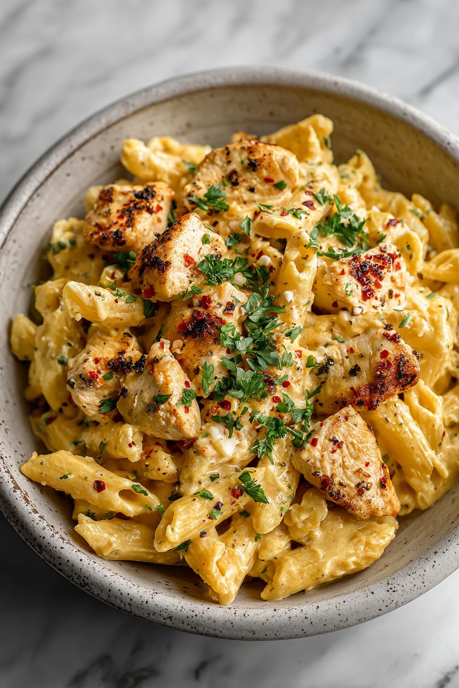 - Toss in cooked pasta and chicken, loosening with a splash of pasta water if needed. Warm through and garnish with parsley.