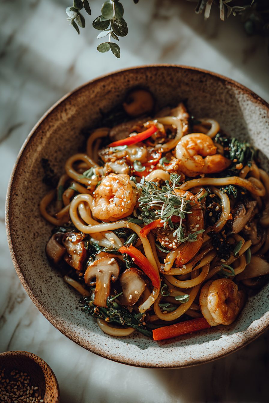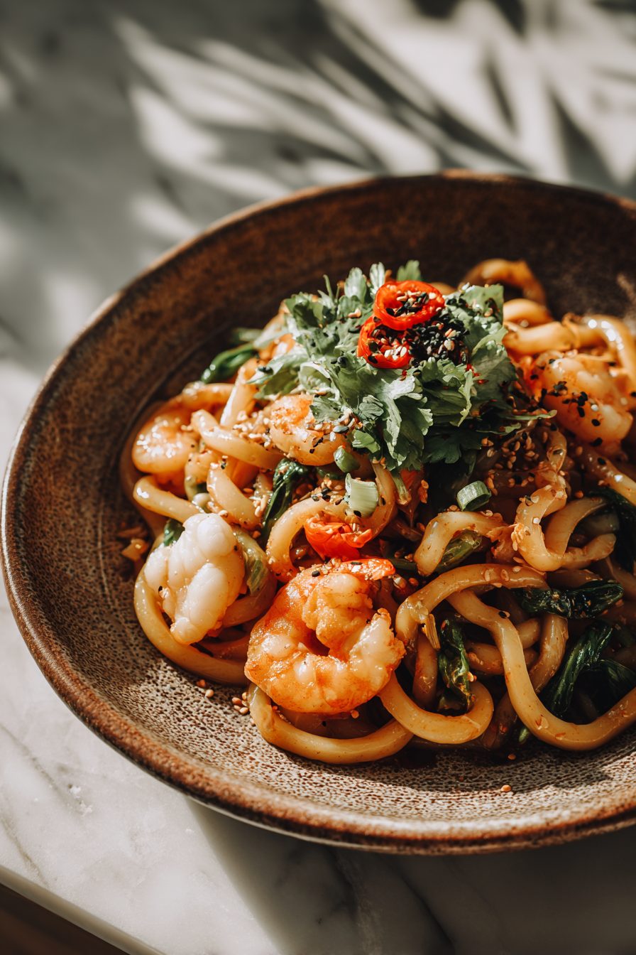Chewy udon stir-fried with juicy shrimp, crisp veggies, and a savory-sweet soy glaze. A fast, satisfying weeknight noodle.