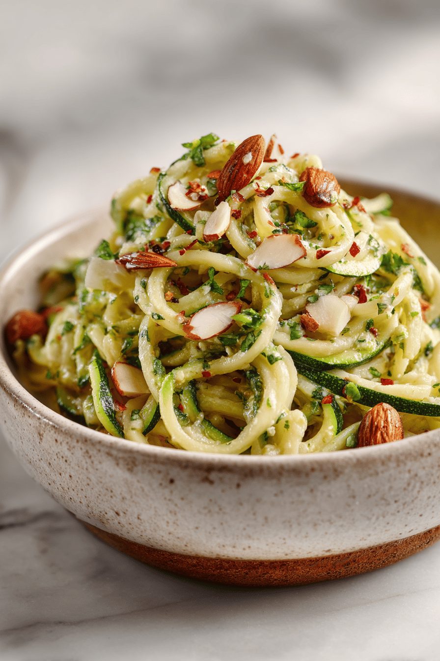 My husband calls this “summer in a bowl” and eats it for lunch like it’s a secret. The kids, who are suspicious of anything green, will scoop up the almonds and then, if we’re lucky, discover the zucchini tucked under. Once I brought this to a backyard barbecue and my little sister (who swears she doesn’t like zucchini) went back three times. True story: I once forgot to salt the pasta water and nearly threw the whole thing out, but tossing in extra lemon and grated pecorino saved the batch. It’s become our go-to when I need something that feels special but doesn’t require babysitting the oven.