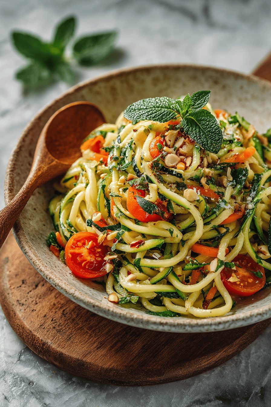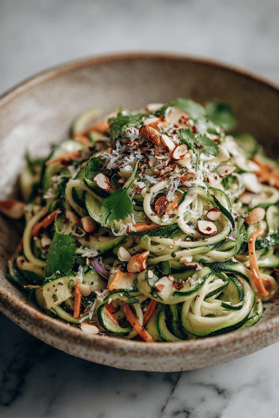 Use pine nuts or pistachios instead of almonds for a different flavor; sunflower seeds work if you need nut-free. Swap lemon for lime + a touch of honey for a sweeter, brighter dressing. Goat cheese or feta adds creaminess if you want a richer salad. I wouldn’t recommend replacing the zucchini with cucumber in this exact dressing — cucumbers bring too much water unless you squeeze them dry first.